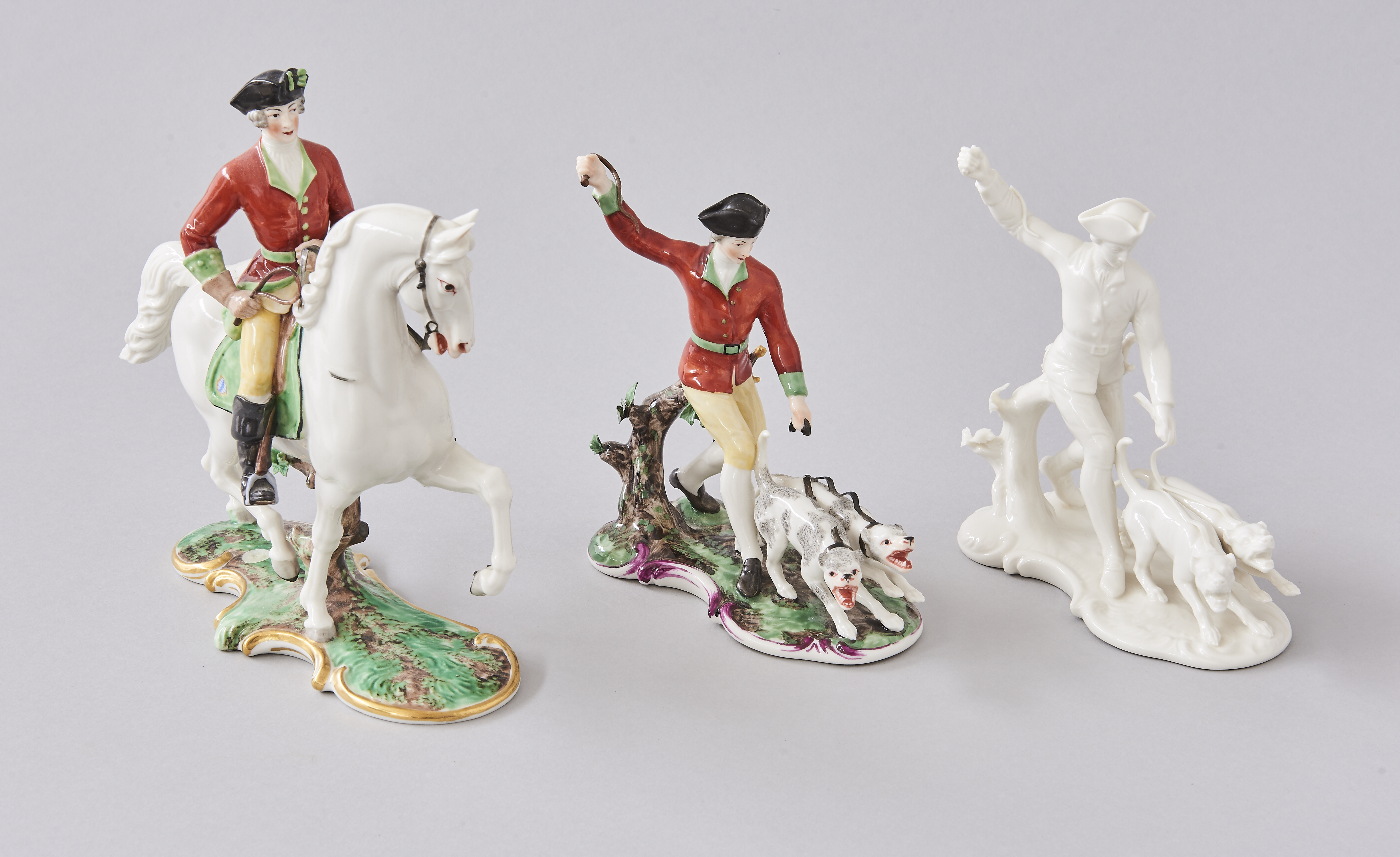 Jäger mit Hund bunt und weiß Höhe je 16,5 cm, Beschädigungen an Blättern und weitere, Reiter Höhe 20,5 cm, Beschädigungen, Schweif gebrochen u. geklebt, weitere, unten Pressmarke Nymphenburg und grüne Marke