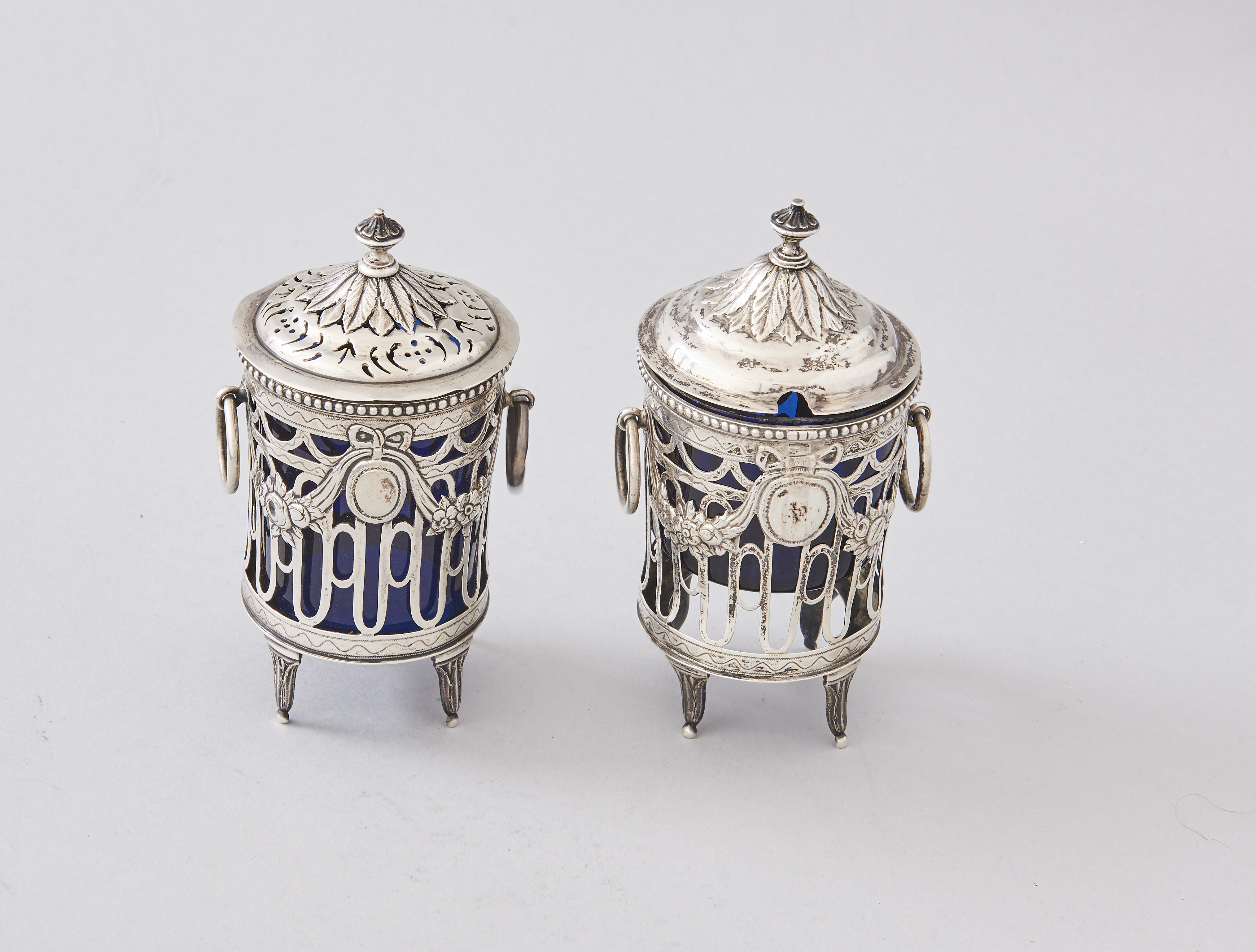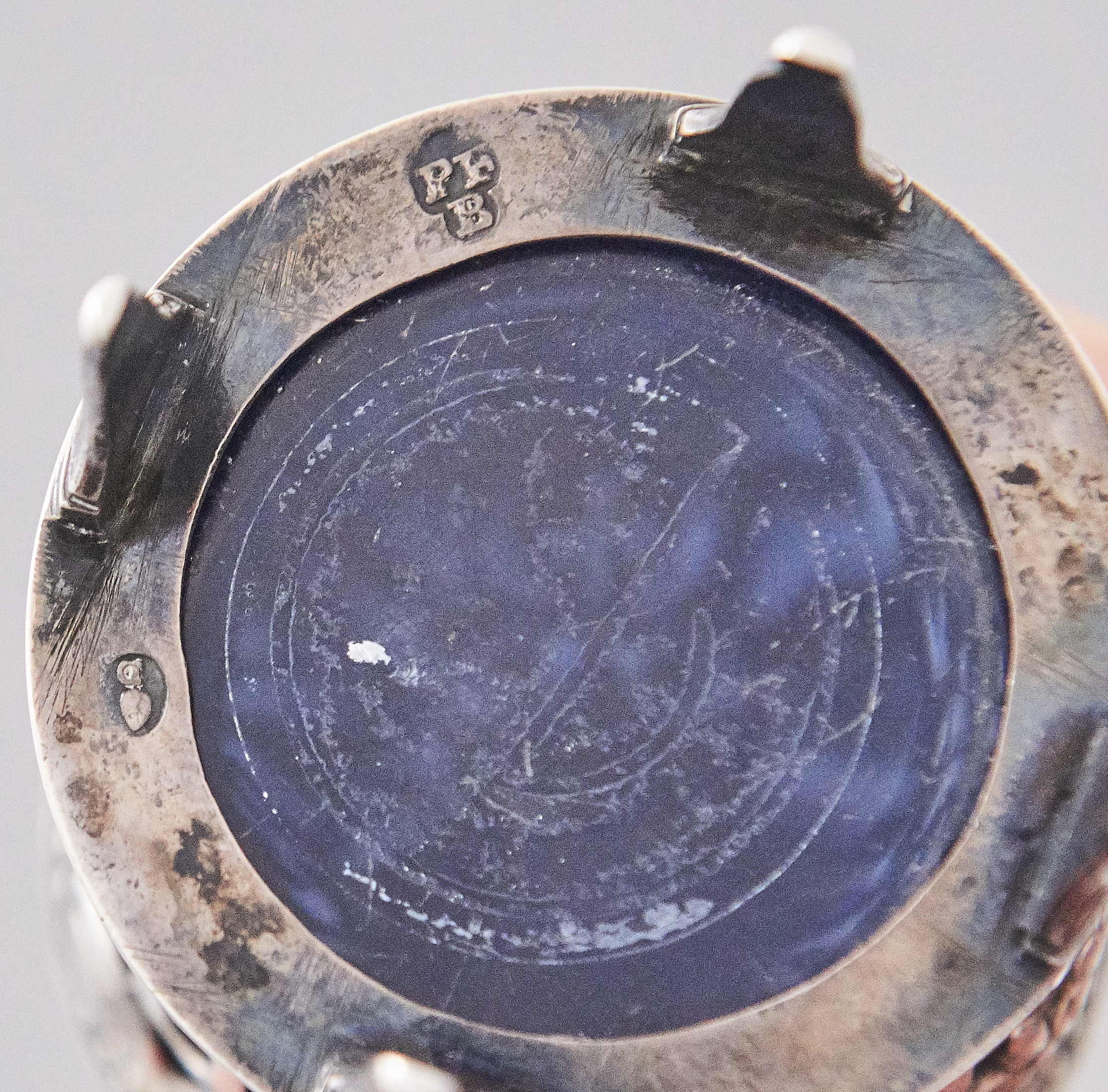 Mit Glaseinsätzen (1 davon nicht passend), Stempel wohl Augsburger Pinienzapfen und Meistermarke 'PFB'.