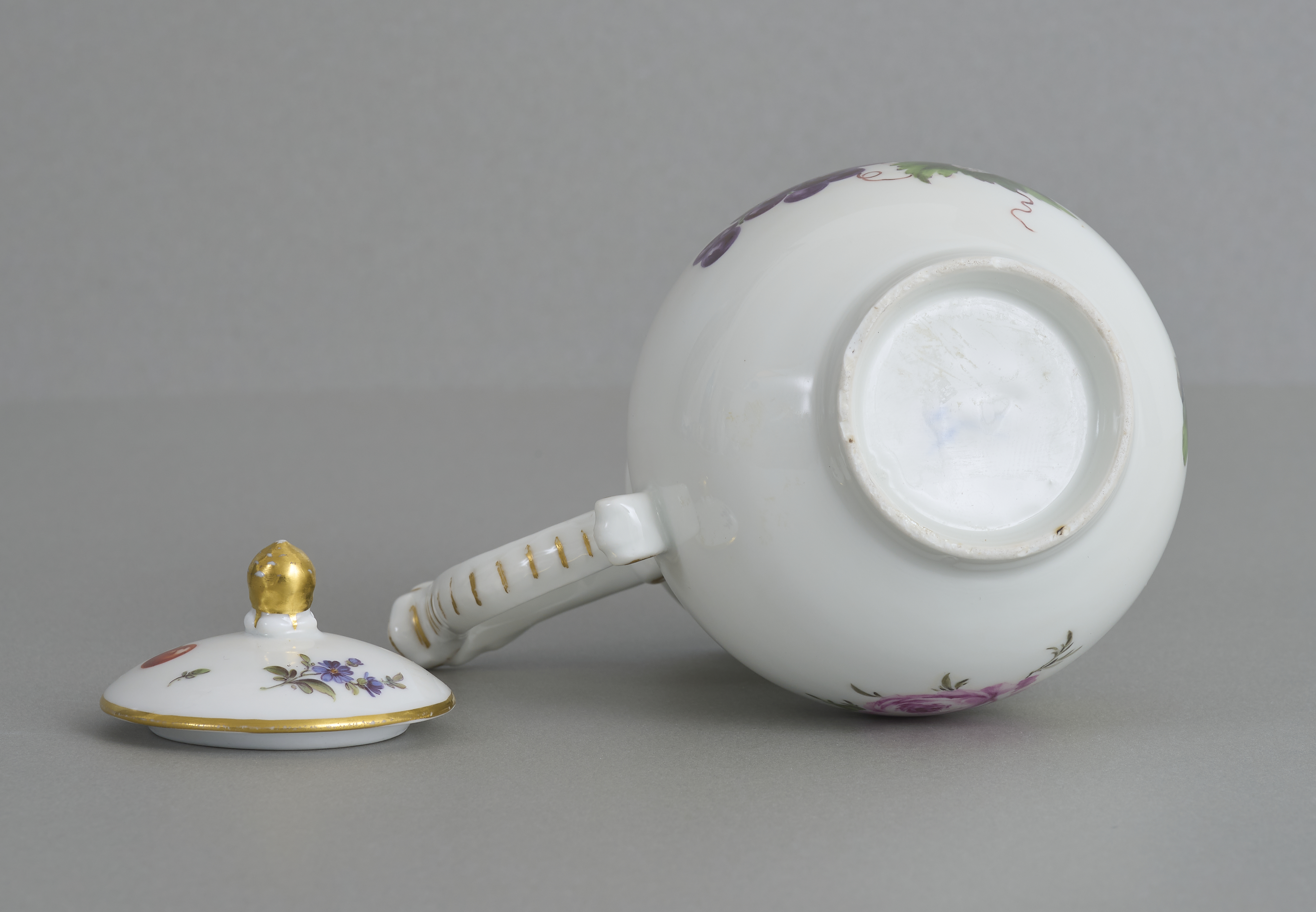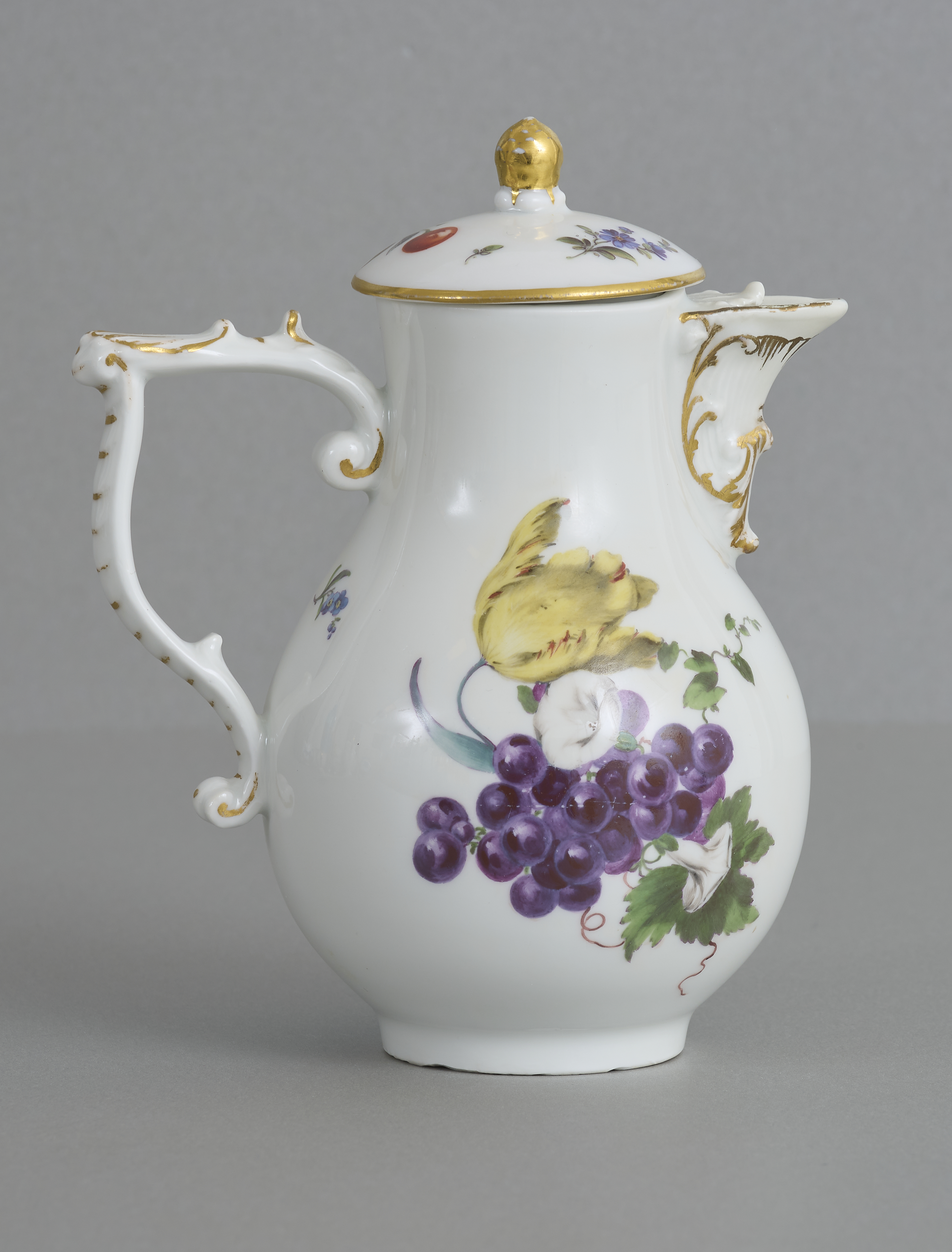 Mit Fruchtmalerei und Schmetterling, unterglasurblaue Schwertermarke, 18. Jhdt., Gold berieben, kleine Chips am Standring. H 15 cm