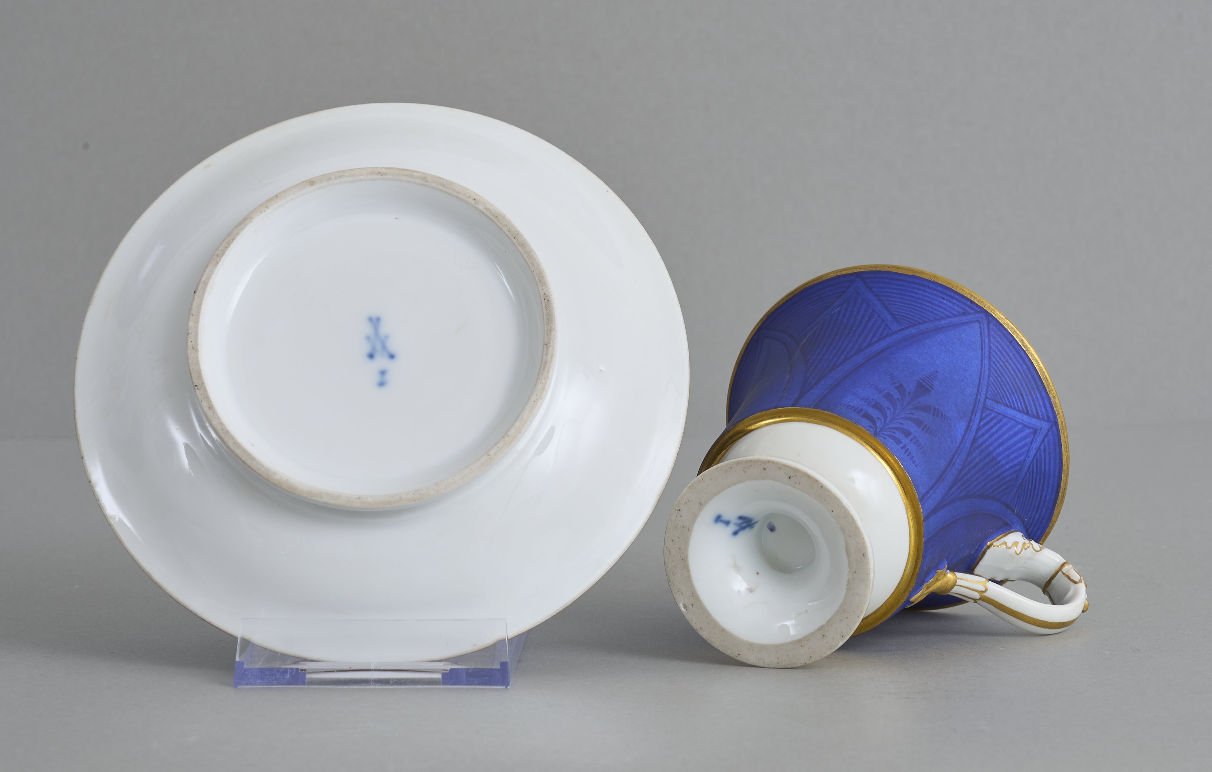 Blauer Fond, vergoldet, Riss innen, unterglasurblaue Schwertermarke, Knaufzeit, H Tasse 9 cm, D Untertasse 13,5 cm