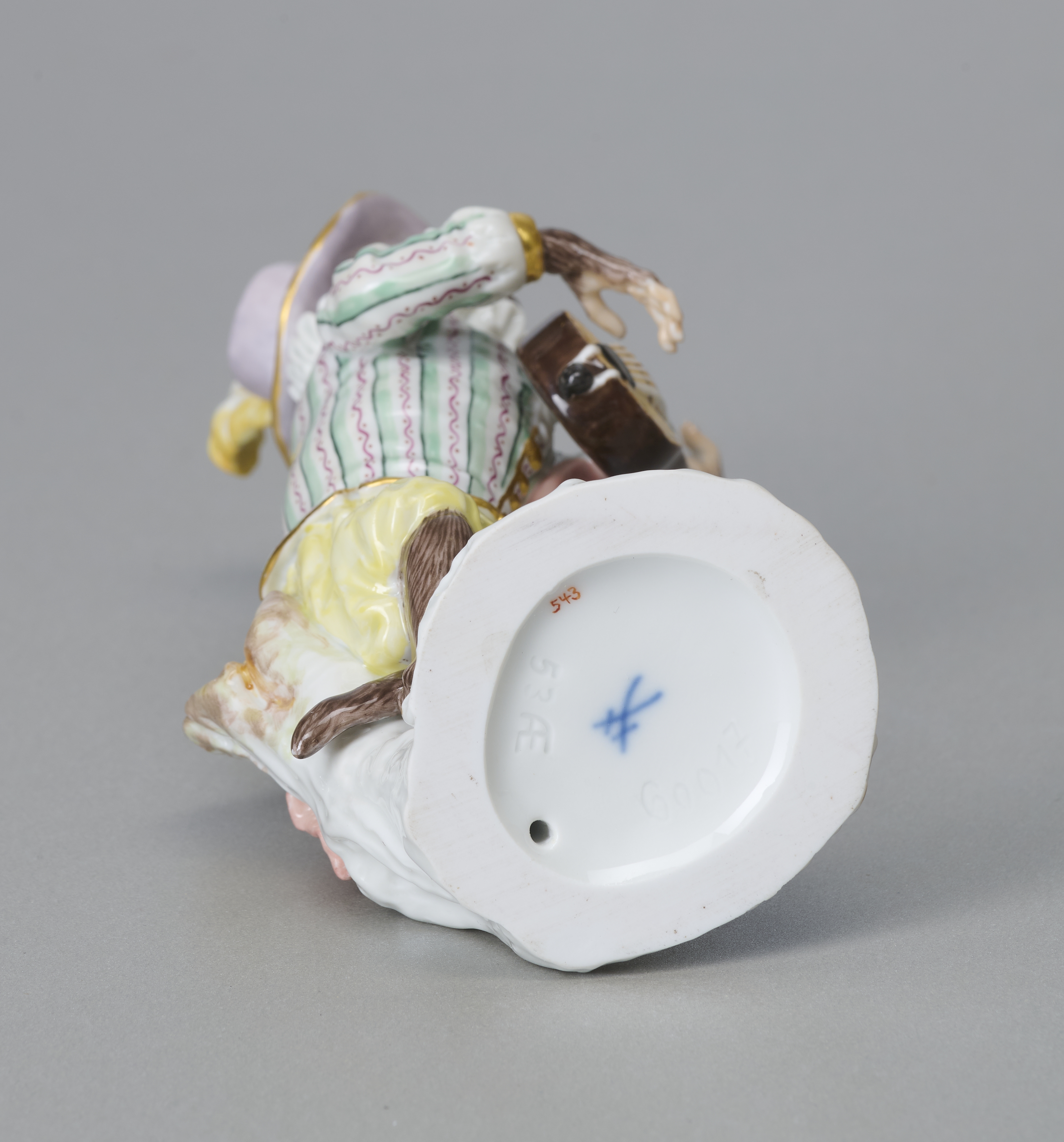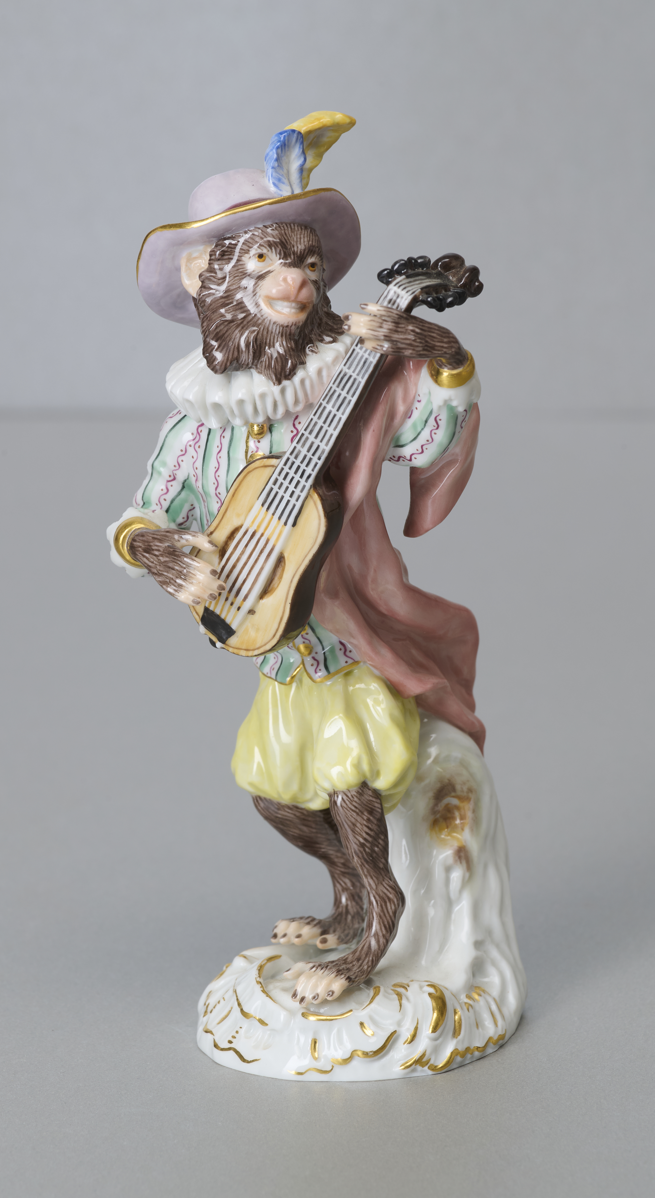 Meissen, Affenkapelle, Gitarrist, 1. Wahl, Entwurf Joachim Kaendler, unterglasurblaue Schwertermarke, nach 1934, Malernummer sowie 60017, H 14,5 cm