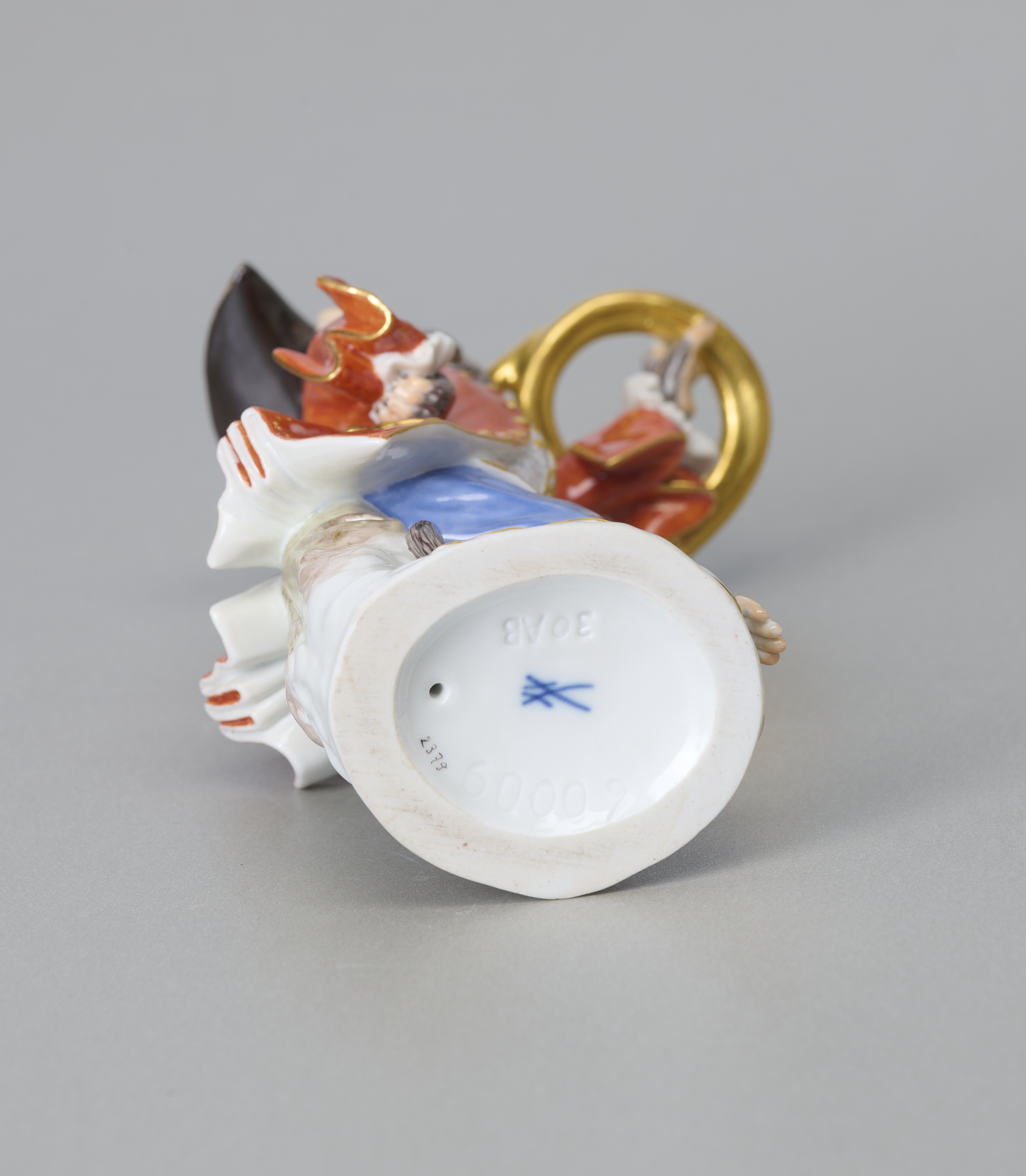Meissen, Affenkapelle, Waldhornbläser, 1. Wahl, Entwurf Joachim Kaendler, unterglasurblaue Schwertermarke, nach 1934, Malernummer sowie 60009, H 14 cm