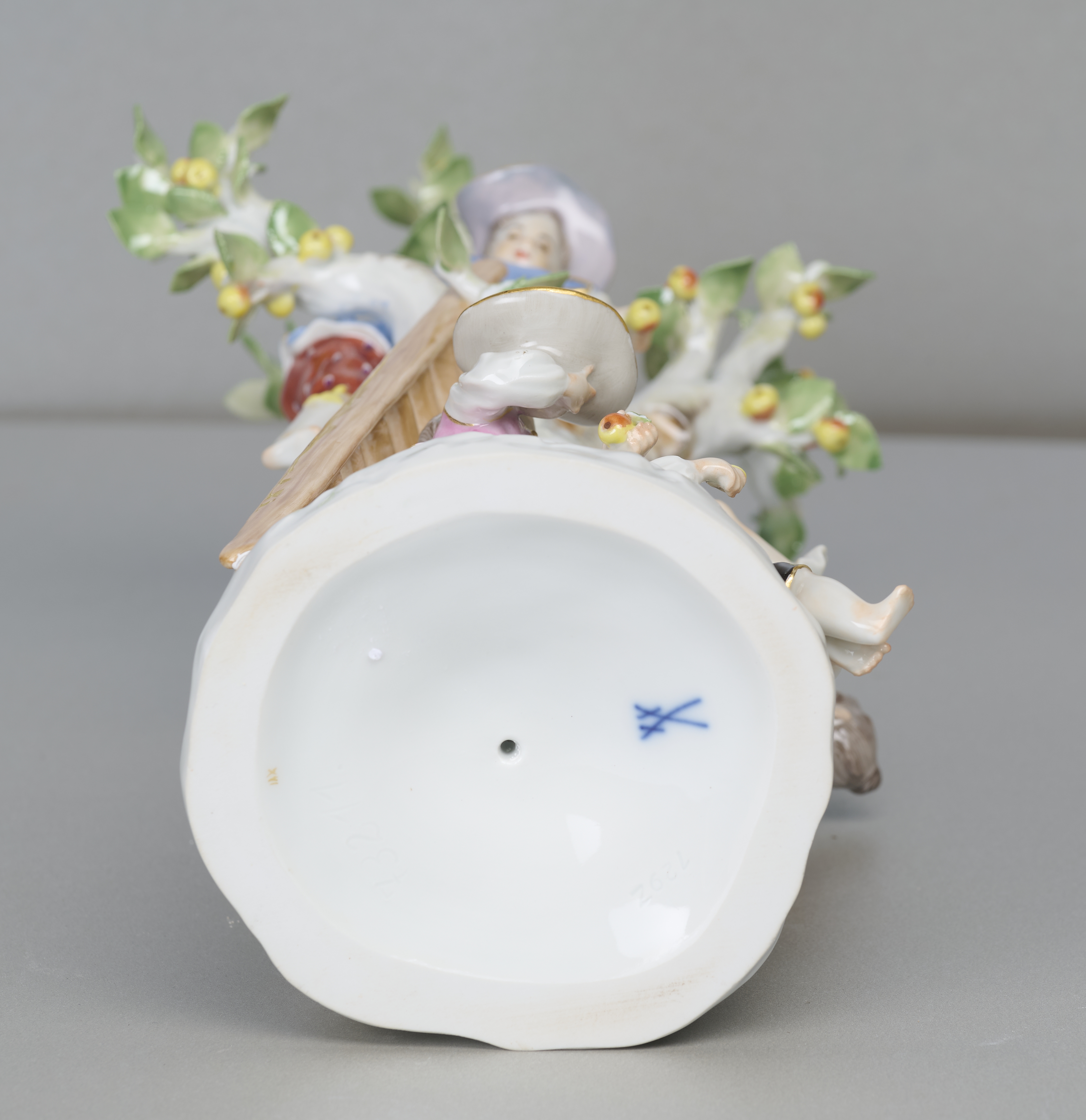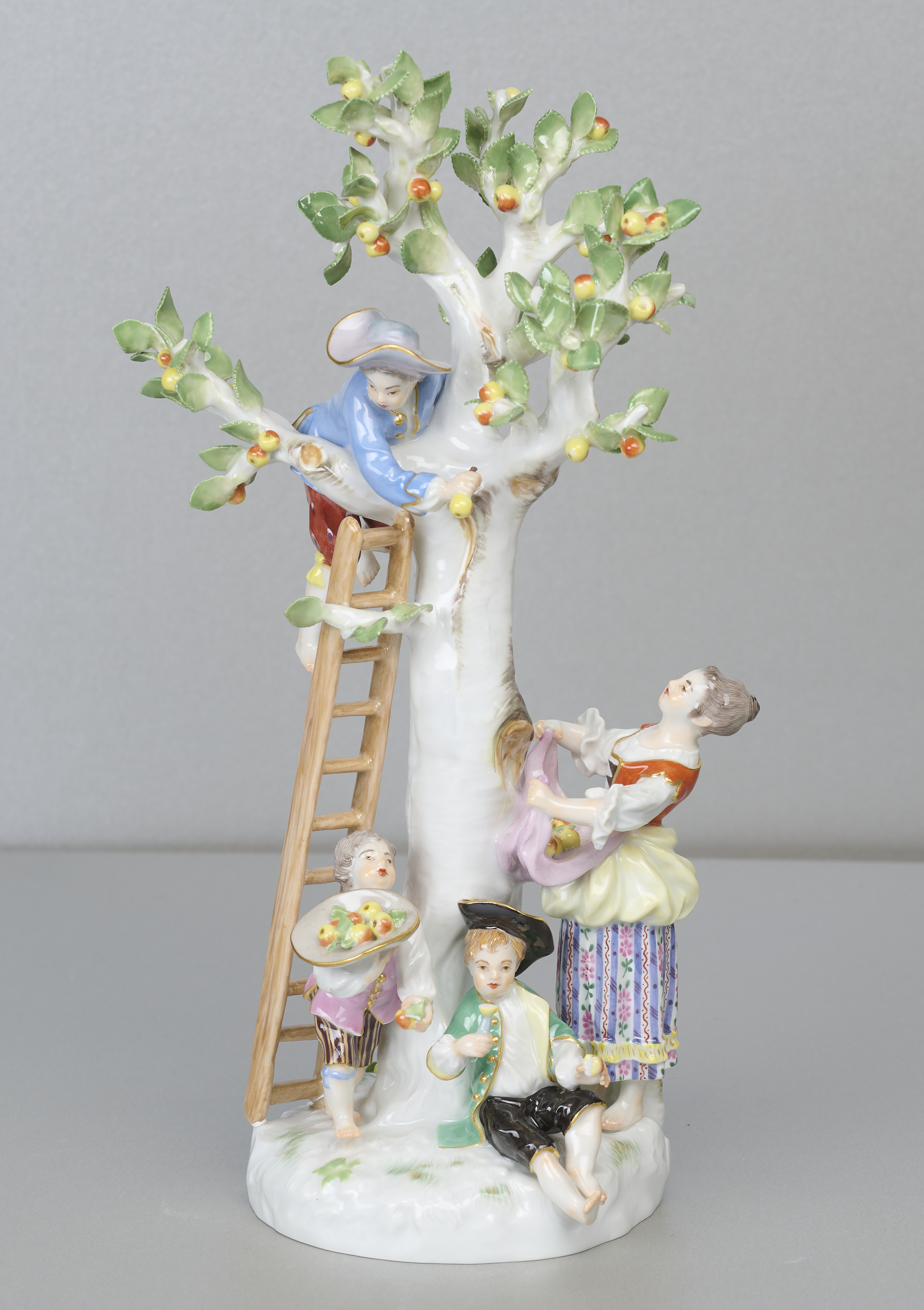 Meissen, Figur, Apfelernte, unterglasurblaue Schwertermarke, Malernummer, Nummer 73211, nach 1934, 1. Wahl, wenige Blätter bestoßen, Leiter am Ansatz geklebt, H 29 cm